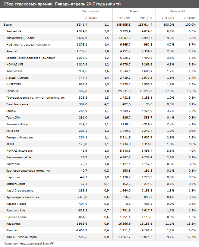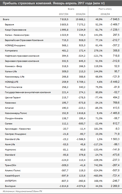 Самым прибыльным страховщиком в текущем году является Евразия - 3,8 млрд тенге за январь-апрель 2017 года, в прошлом году прибыль составила 7,3 млрд.