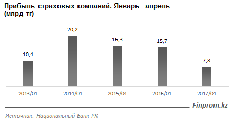 Страховщики увеличивают сборы премий, но прибыли падают. Совокупный чистый положительный результат деятельности страховых компаний за январь-апрель 2017 года сложился в размере 7,9 млрд тенге, что на 50,1% меньше, чем за аналогичный период 2016 года (прибыль тогда составила 15,7 млрд тенге).