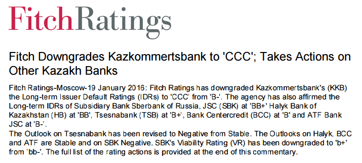 Международное рейтинговое агентство Fitch Ratings понизило долгосрочный рейтинг дефолта эмитента (РДЭ) Казкоммерцбанка до категории «CCC» с категории «B».