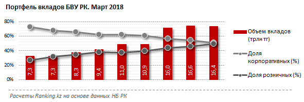 За март 2010-2018 года перекос в структуре вкладов БВУ РК сократился до минимума. Если на конец марта 2010 года в портфеле вкладов преобладали со значительным перевесом корпоративные депозиты – 72,9% против 27,1% розничных вкладов, то уже на конец марта 2018 года на долю вкладов юрлиц приходится 50,8%, доля вкладов физлиц составляет 49,2%. Годом ранее было 54,4% и 45,6% соответственно.