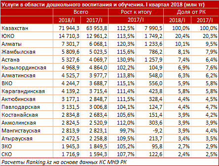 По итогам I квартала объем услуг в сфере дошкольного воспитания и обучения составил 71,9 миллиарда тенге — на 12,5%, или восемь миллиардов тенге больше, чем годом ранее, сообщает Ranking.kz.