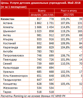 Больше всего средств в дошкольное обучение детей среди жителей крупных городов и мегаполисов страны приходится вкладывать астанчанам — здесь одно посещение детских дошкольных учреждений обходится родителям малышей сразу в 1862 тенге, на 7,6% больше, чем год назад.