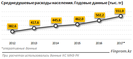 В многолетней динамике средние расходы на душу населения росли на 4-10% в год. За последние 5 лет расходы казахстанцев увеличились на 168,4 тысячи тенге, что составило 44%. А по итогам 2017 года на 48,8 тысячи тенге, или 9,7%.
