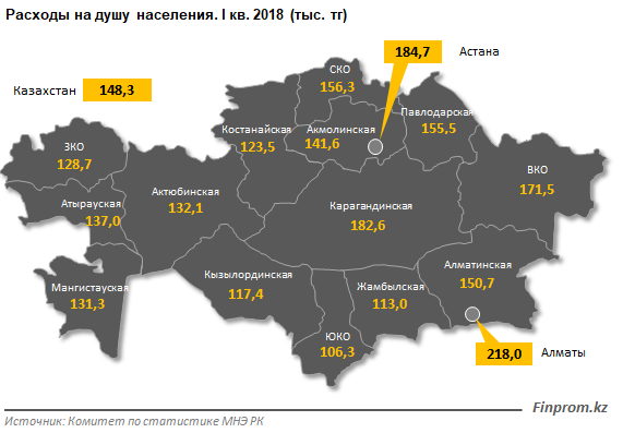 Самый высокий уровень среднедушевых расходов сохраняется в обеих столицах: Алматы — 218 тысяч тенге и Астане — 184,7 тысячи тенге. Также в топ-3 попала Карагандинская область, жители которой в среднем тратят по 182,6 тысячи тенге.
