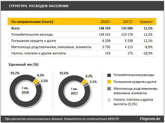 Основной статьей расходов населения остаются потребительские траты, состоящие из расходов на продовольственные и непродовольственные товары и платные услуги. Совокупная доля потребительских расходов в I квартале текущего года составила 93,2%, или 138,2 тысячи тенге.