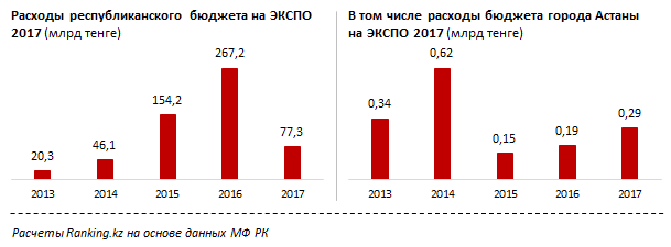 Согласно Закону о республиканском бюджете, за пять лет подготовки к проведению международной выставки ЭКСПО-2017 было выделено 565,1 млрд тенге, или $2,1 млрд. В том числе из бюджета Астаны - 1,58 млрд тенге, пишет ranking.kz.