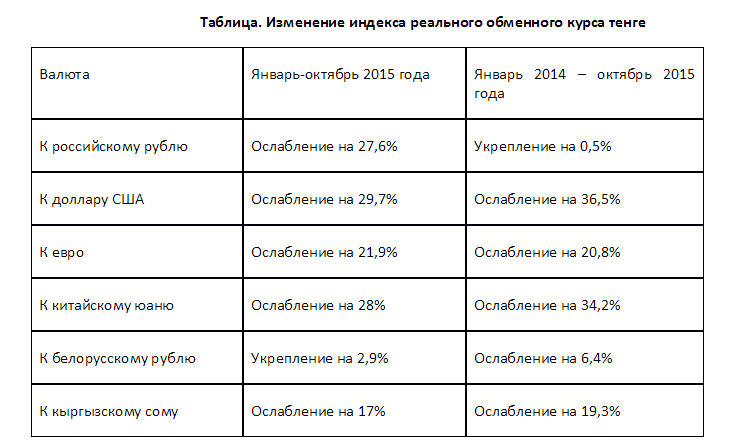За 10 месяцев 2015 года произошло ослабление тенге в реальном выражении на 24,7% на базе индекса реального эффективного обменного курса к валютам 34 стран. При этом с начала 2014 года по октябрь 2015 года ослабление тенге было на уровне 20%.