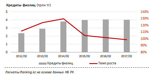 До этого 5 лет подряд объем кредитов физлиц каждый год увеличивался. К концу февраля 2014 года годовой прирост составил 29,8%, до 3,79 трлн тенге, в следующие 2 года годовой прирост начал сокращаться – до 5,1% к концу февраля 2015 года и до 1,9% к аналогичному периоду 2016 года.