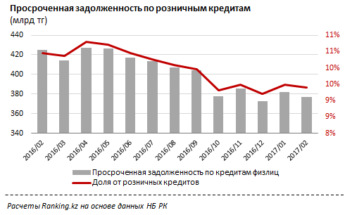 Банки РК активно оздоравливают свой портфель по розничным займам. Объем просроченной задолженности по кредитам физлиц за год (к концу февраля 2017 года) сократился на 11,3% (49,1 млрд тг) и составил 376,7 млрд тенге. Для сравнения: в конце февраля 2016 года был зафиксирован годовой прирост просрочки на 6,2%, говорится в исследовании ranking.kz.