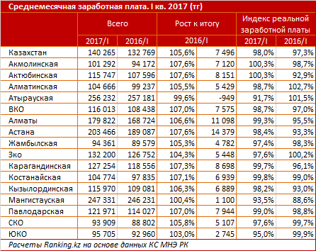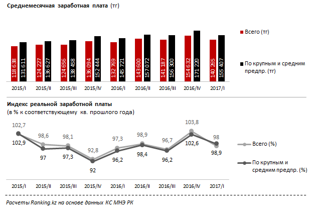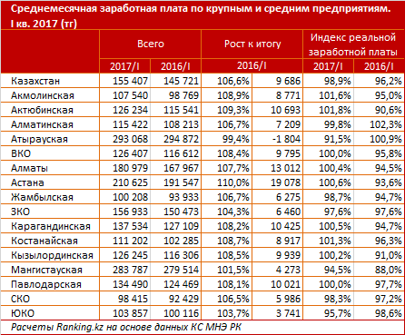 По итогам 1 квартала 2017 года среднемесячная заработная плата казахстанцев составляла 140,3 тыс. тг, что на 5,6% выше, чем в аналогичном периоде годом ранее. В то же время для сотрудников крупных и средних предприятий этот показатель достигал 155,4 тыс. тг - на 6,6% больше, чем годом ранее.