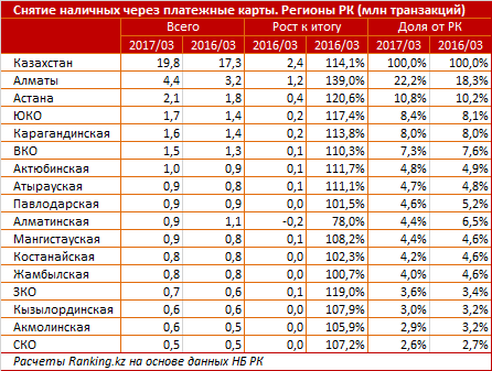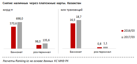 Количество операций по снятию через банкомат в марте 2017 года по сравнению с мартом 2016 выросло на 22,3%, с 16,5 млн до 18,7 млн транзакций, сумма операций увеличилась на 22,3% и составила 698,0 млрд тенге. Транзакций по обналичиванию денег через pos-терминалы выросли на 41,0%, до 1,1 млн операций, объем вырос на 38,4% и составил 135,6 млрд тенге.