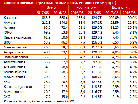 По объему снятых средств через платежные карты в марте 2017 года лидируют мегаполисы Алматы и Астана, их совокупная доля от РК составляет 36,7% (в марте 2016 - 32,4%). В Алматы было снято наличных на сумму 212,3 млрд тенге, что составляет более четверти объема обналиченных денег от РК. Рост по сравнению с мартом 2016 года составил 47,1%.