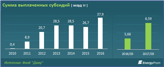 За 2016 год объем выделенных субсидий увеличился на 42%. За первый квартал 2017 года выделено 6,59 млрд тенге субсидий, что на 16% превышает текущий период прошлого года - 5,66 млрд тенге.