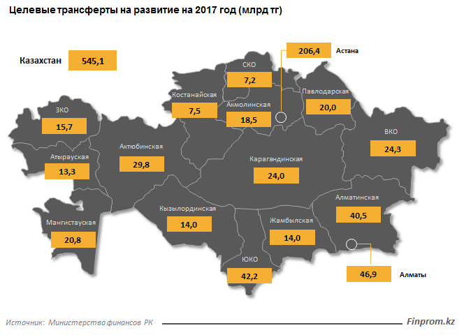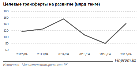 Объем средств на Алматы, напротив, сократили на 37%, до 46,9 млрд тенге в текущем году. Трансферты в ЮКО увеличатся в 2 раза и составят 42,2 млрд тенге.
