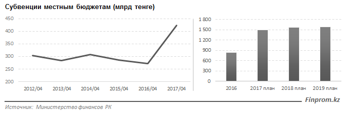 С этого года наблюдается резкое увеличение выделяемых субвенций из республиканского бюджета. Если в 2016 году их сумма составляла 836,9 млрд тенге, то в текущем году она оценивается в 1,5 трлн тенге (+78%). Уже за четыре месяца текущего года местным бюджетам было выделено 423,3 млрд тенге, что на 55% превышает объем финансирования за аналогичный период прошлого года.
