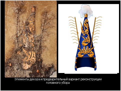 Останки находились на глубине 1,7 м под насыпью кургана в каменном саркофаге, укрытом массивными гранитными плитами. Там же ученые нашли керамические и деревянные сосуды и кости жертвенного животного. У головы погребенной ученые нашли золотые серьги и каменный жертвенник.