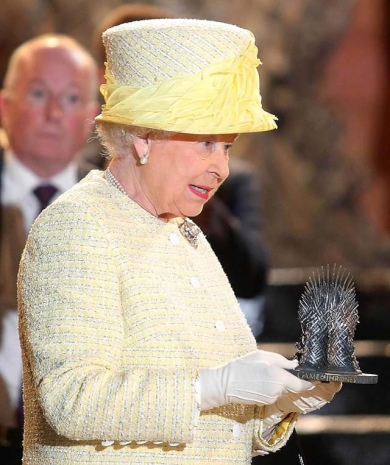 Елизавета II и ее супруг герцог Эдинбургский Филипп сегодня днем посетили съемочную площадку сериала «Игра престолов». Визит состоялся в рамках путешествия по Северной Ирландии. Королева осмотрела достопримечательности, приняла в подарок миниатюрный железный трон, отказавшись при этом сесть на настоящий.