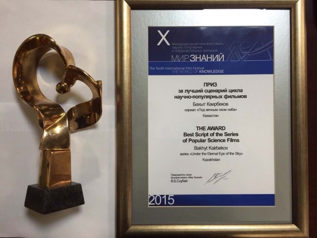 Казахстанский фильм «Под вечным оком неба» известного кинорежиссера Бахыта Каирбекова стал победителем Х Международного кинофестиваля научно-популярных и образовательных фильмов «Мир знаний» - The World of Knowledge в номинации «Лучший сценарий». Сегодня в Астане престижную награду передали вице-министру культуры и спорта Казахстана Г. Ахмедьярову, сообщает пресс-служба ведомства.