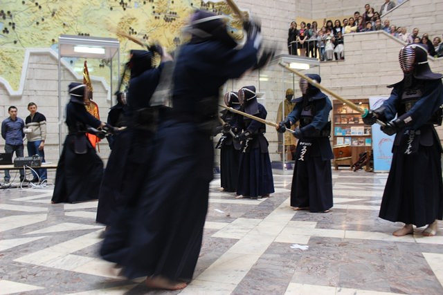 Когда завораживающая «дробь» утихла, сквозь толпу зрителей двинулось шествие в доспехах и кимоно, молодые люди, вооруженные деревянным аналогом катаны – это ученики алматинской школы Кэндо. В переводе на русский язык это боевое искусство звучит как «путь меча».