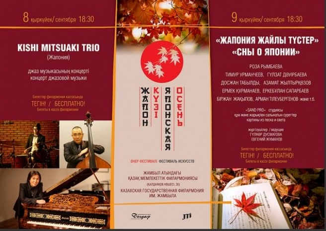 Лидер группы – пианист и композитор Киши Мицуаки – широко известен в мире джаза. Его выступления проходят по всему миру; он выпустил 14 альбомов, три из которых удостоились премии Selective Gold Disc журнала « Swing » - старейшего и наиболее авторитетного джазового журнала Японии. Последний альбом музыканта - «Love at First Sight» - был записан в Нью-Йорке и выпущен в апреле 2013 года. Киши сочинял музыку для рекламы и телевидения, работал для телеканала NHK. В его команде - один из наиболее популярных контрабасистов Японии Терумичи Ямада и молодой талантливый барабанщик Кадзуяки Йокояма. Для казахстанского зрителя команда готовит музыкальный сюрприз – казахскую народную мелодию в джазовой интерпретации.