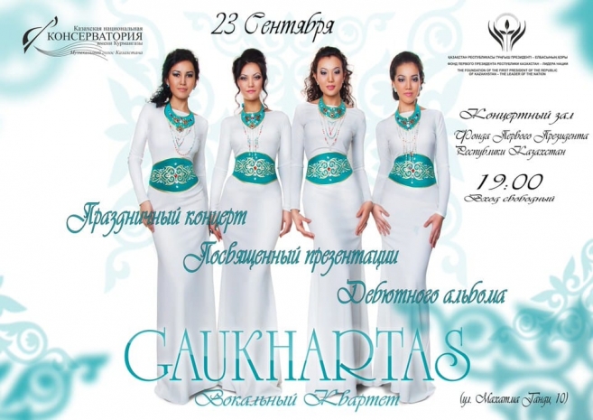 Вокальный квартет “Гаухартас” выступит перед алматинской публикой уже 23 сентября. Концерт состоится в 19:00 по адресу: г. Алматы, ул. Махатмы Ганди, 10, в концертном зале Фонда Первого Президента Республики Казахстан. Концерт посвящен выпуску дебютного альбома, сообщает корреспондент ИА Total.kz со ссылкой на пресс-службу Управления культуры г. Алматы.