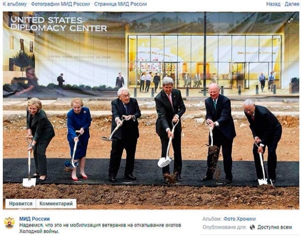 На фото запечатлены госсекретарь США Джон Керри и его предшественники Генри Киссинджер, Джеймс Бейкер, Мадлен Олбрайт, Колин Пауэлл и Хиллари Клинтон. Известные политики участвовали в церемонии закладки фундамента Дипломатического центра в Вашингтоне, которая состоялась 3 сентября. Деятели держат в руках лопаты, и видно, что усердно и сосредоточенно ими орудуют. МИД России не остался в стороне, написав: «Надеемся, что это не мобилизация ветеранов на откапывание окопов холодной войны».
