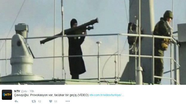 Министр иностранных дел Турции Мевлют Чавушоглу назвал инцидент провокацией. «Если солдат на российском военном корабле выставляет напоказ гранатомет или что-то еще наподобие ракет противовоздушной обороны, то это чистой воды провокация», - цитирует ВВС дипломата.