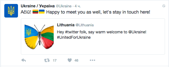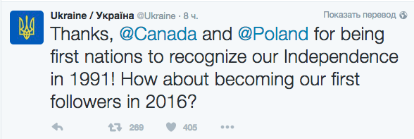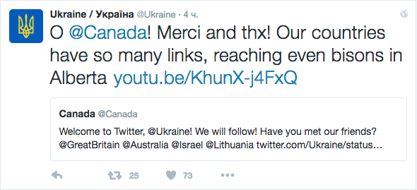 Первые твиты в Twitter Украины были посвящены отношениям с Польшой и Канадой, которым шутливо предложили стать первыми фолловерами. Последние согласились, предложив читать аккаунты Великобритании, Израиля и Австралии.