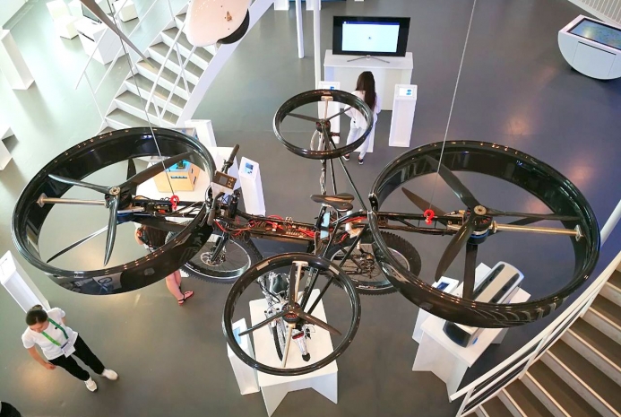На то чтобы создать такое чудо техники, специалистам понадобился почти один год. Процесс создания включал в себя проектирование виртуального прототипа, потом изготовление его физического варианта, а следом – тестирование, оптимизирование и полностью скоординированный взлет модели. Велосипед длиной 3,8 метра, шириной 2,5 метра и высотой 1,2 метра в воздух поднимают шесть пропеллеров. Основной несущей конструкцией является дюралюминиевая сварная рама. Работает «воздушный транспорт», как можно догадаться, на принципах квадрокоптера и вертолета. Собственный его вес составляет 95 кг, а общий взлетный вес – 170 кг. Из простого расчета следует, что кататься на нем сможет человек весом до 80 кг. У велосипеда четыре двигателя по 10 киловатт каждый и два – по 7 киловатт.
