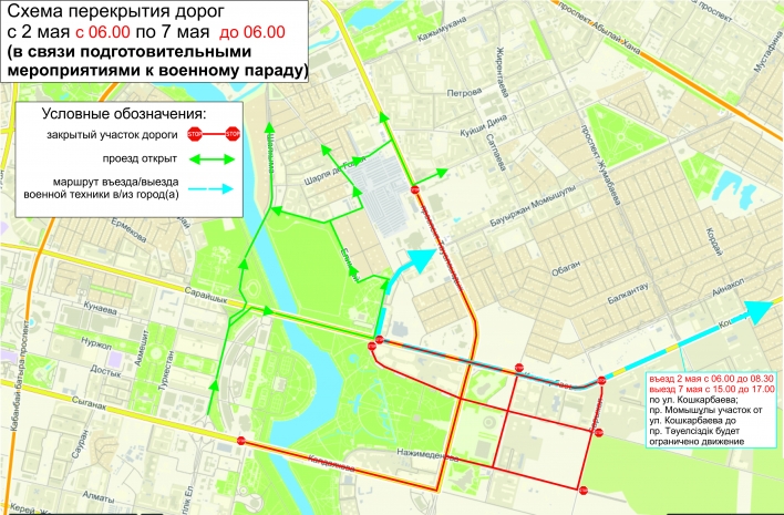 В это же время ограничено движение по проспекту Тауелсыздык на участке от ул. Б. Майлина до школы на улице Нажимеденова; по улице Ш. Калдаякова – от моста М3 до пр. Тауелсыздык.