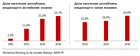 На конец 2016 года в стране зарегистрировано 2,9 тысячи средств массовой информации (+11% к 2015 году – прим. ИА Total.kz), из которых 23% – государственные. В государственных СМИ 71% информационных потоков – на казахском языке, еще годом ранее показатель оценивался на уровне 60%. Однако, согласно проведенному Министерством культуры и спорта РК опросу, пользователи считают государственные СМИ на казахском языке малопривлекательными и часто неактуальными, а также существует много неинформативных и несодержательных сайтов. Казахстанцы активно осваивают английский язык под влиянием процессов глобализации. Если в 1991 году доля населения, владеющего английским языком, составляла лишь 2%, к 2012 году она увеличилась до 11,6%, а сегодня составляет уже 23,7%. На этом фоне процент трехъязычного населения страны увеличивается – с 16% в 2015 году до 20% на конец 2016 года. Напомним, что с 2016 года принцип трехъязычия был внедрен в систему образования РК.