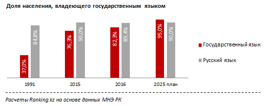 За годы независимости доля казахскоязычного населения выросла с 37% в 1991 году до 76,3% в 2015 году, составив на конец 2016 года уже 82,3%. Одновременно растет число изучающих язык – плюс 22,3% к 2015 году. Что касается русскоязычного населения, то доля их сократилась на 0,6% к 2015 году, составив 89,4%. Согласно госпрограмме развития и функционирования языков, ожидается, что к 2025 году преобладать в стране будет знание казахского языка: 95% населения будут свободно говорить на казахском языке, 90% на русском.