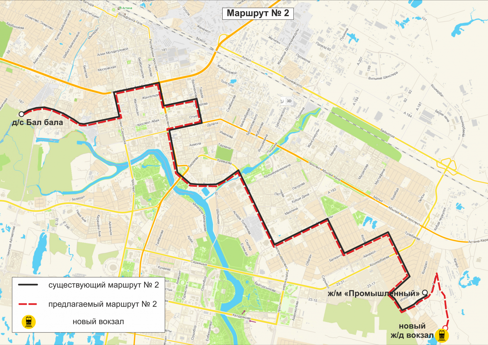 С начального остановочного пункта «Детский сад «Бал-бала» до остановочного пункта «Улица Бастобе» без изменения, далее ул. Шарбакты – съезд до ж/д вокзала – «Вокзал «Нұрлы жол». В обратном направлении аналогично.