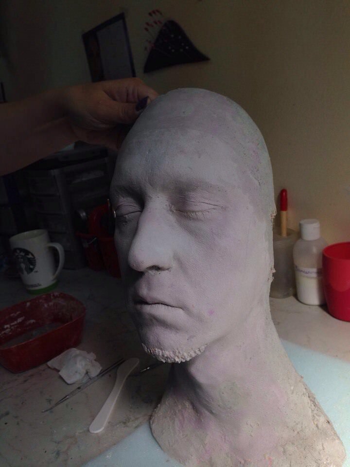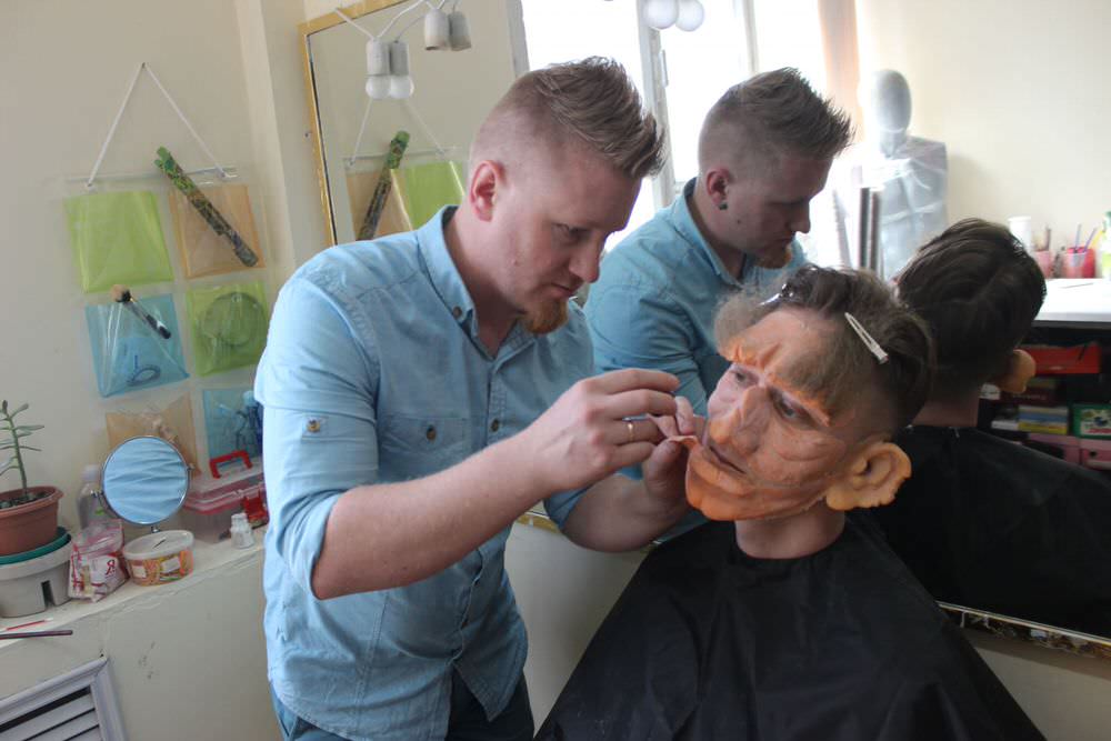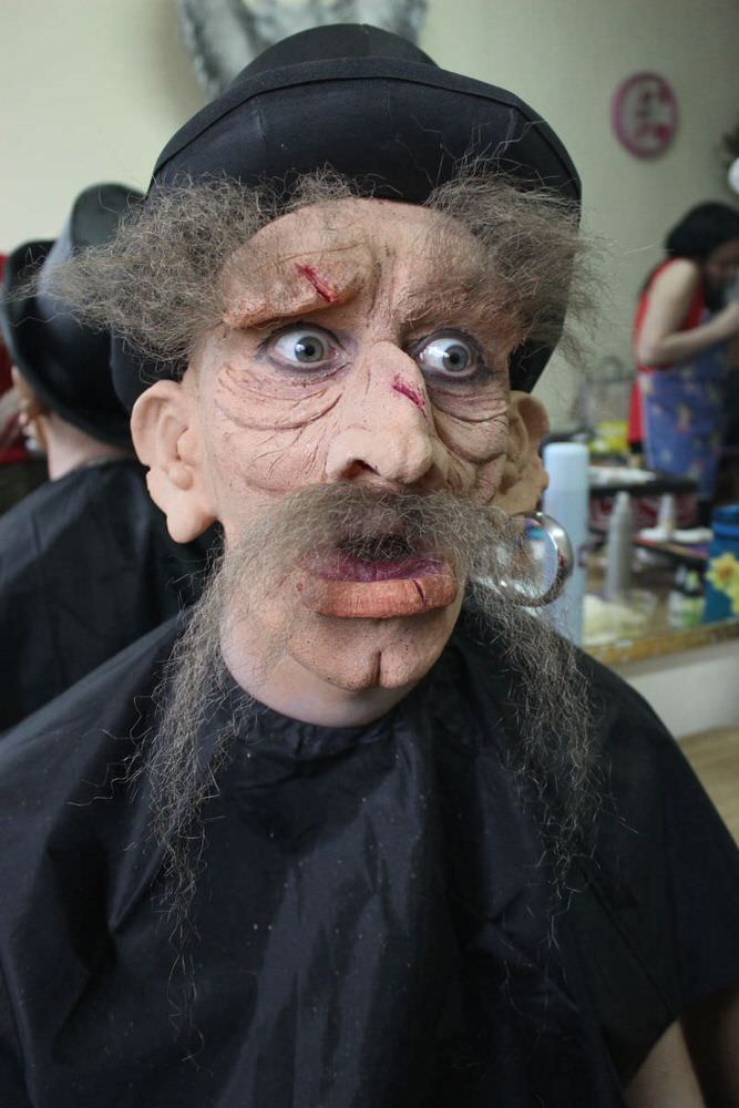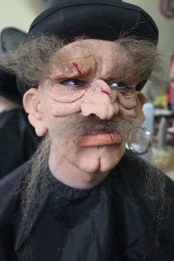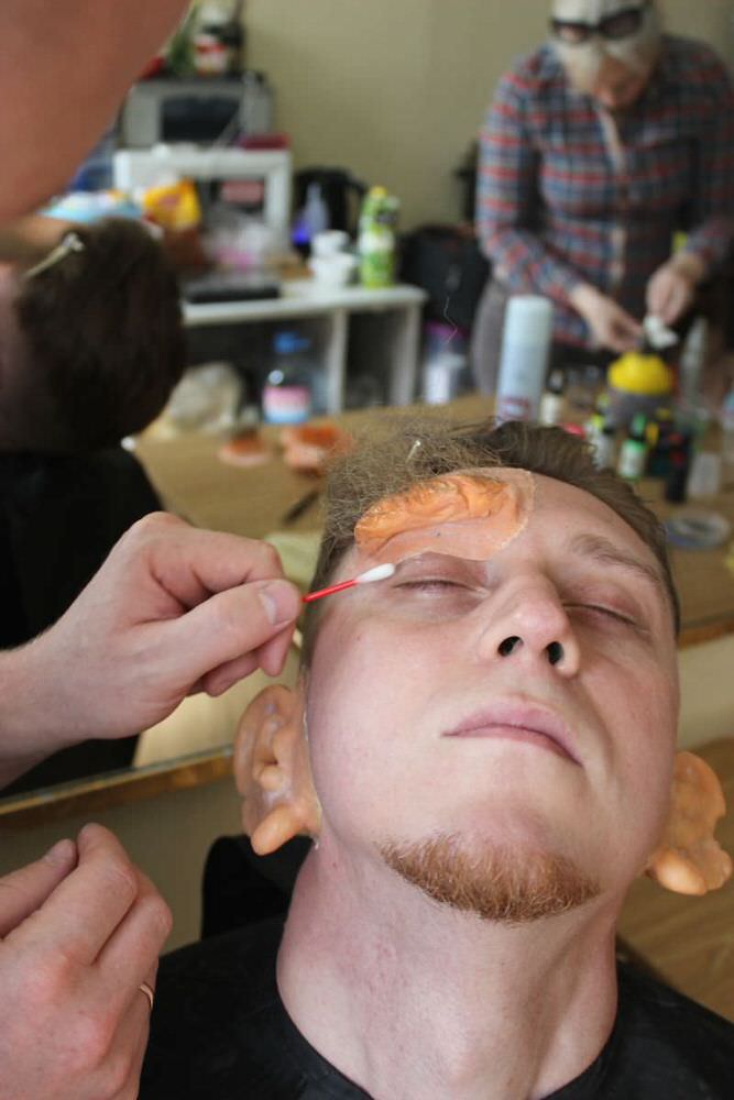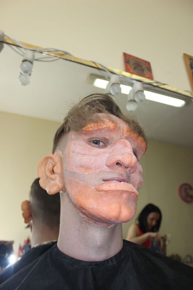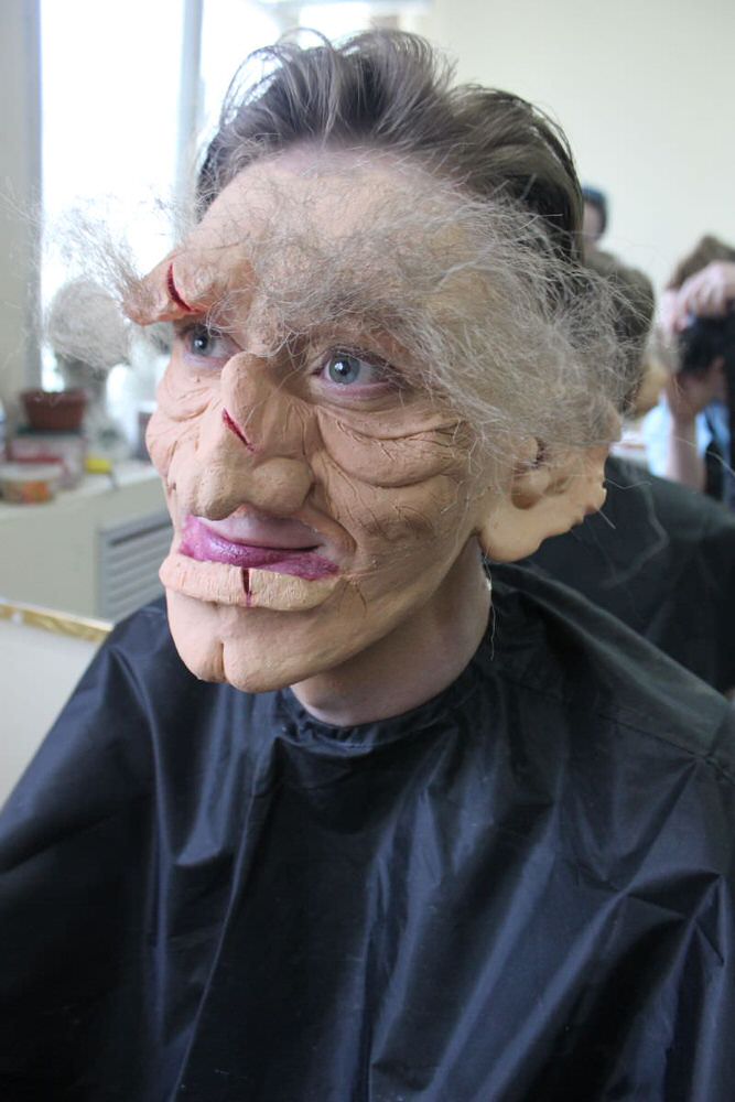 Далее настает черед для макияжа, мастер всеми доступными средствами скрывает стыки, создает общий тон кожи. Обретают очертания мелкие детали, шрамы, родинки, морщины.