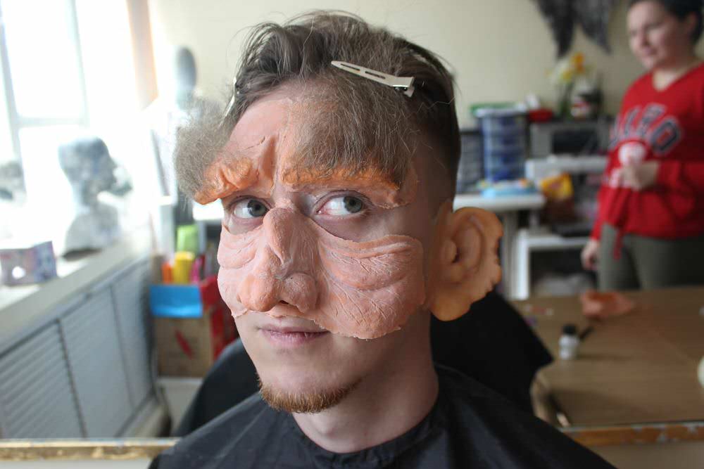 Когда все готово, создатель образа «бровастого старичка» – Дмитрий Дягилев, режиссер театра «Свой», приступает к экзаменационной работе. Секрет достижения максимального реализма кроется в аккуратности, каждый миллиметр накладки получает особое внимание.