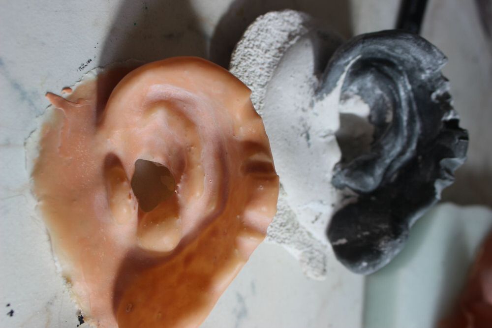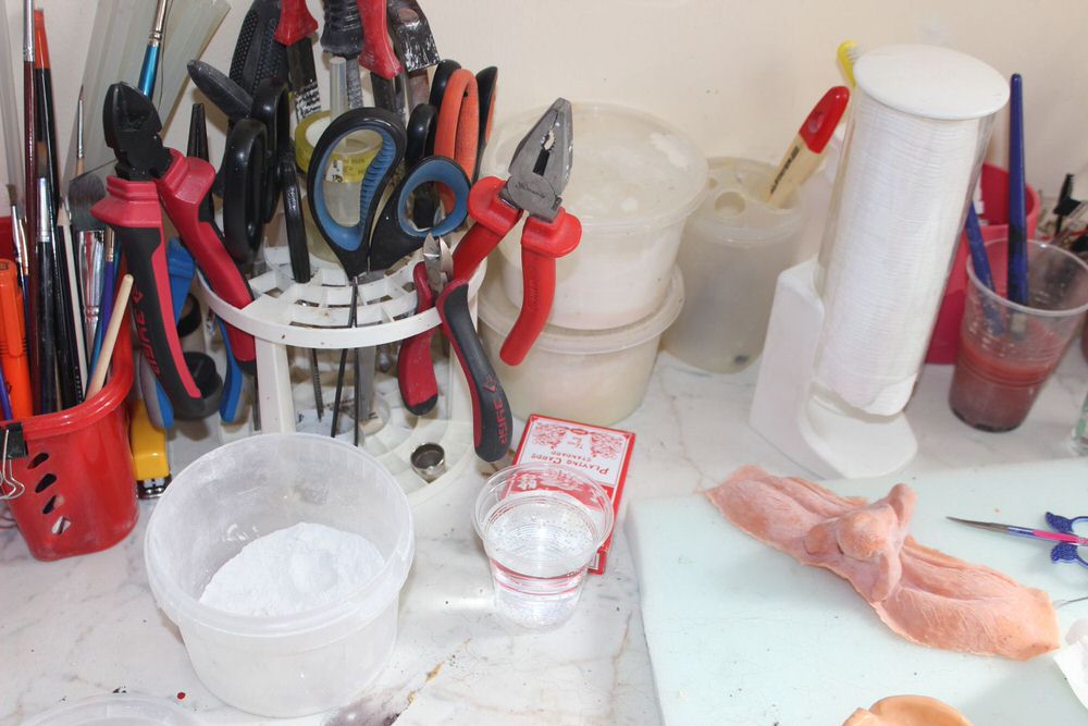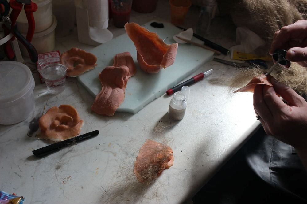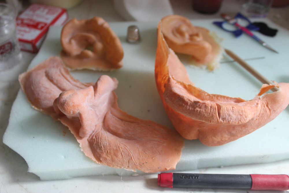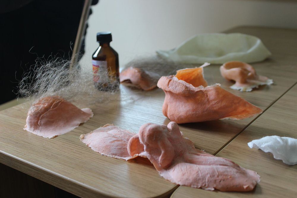 Накладки из латекса выполняют основу будущего образа, благодаря эластичности плотно прилегающий материал телесного цвета вкупе с театральным макияжем позволяет повторять мимику актера. В результате возникает иллюзия живого лица, а не маски. Мастер старательно очищает заготовки, обрабатывает «детали лица» тальком, приклеивает волосы.