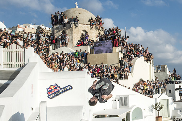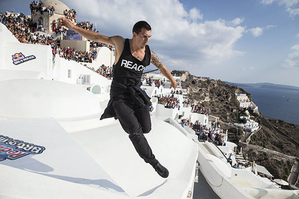 В субботу Димитрис Кирсанидис “DK” проложил себе дорогу к впечатляющей победе во фриране, выполняя сальто, прыжки и сложные трюки в финале состязаний Red Bull Art of Motion 2015г. Он второй год подряд становится победителем на сложной трассе острова Санторини, Греция.