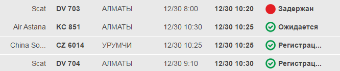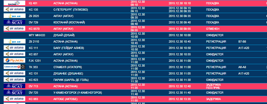 Вылет. Электронное табло международного аэропорта Алматы.
