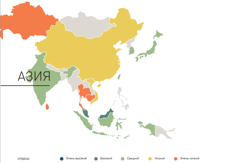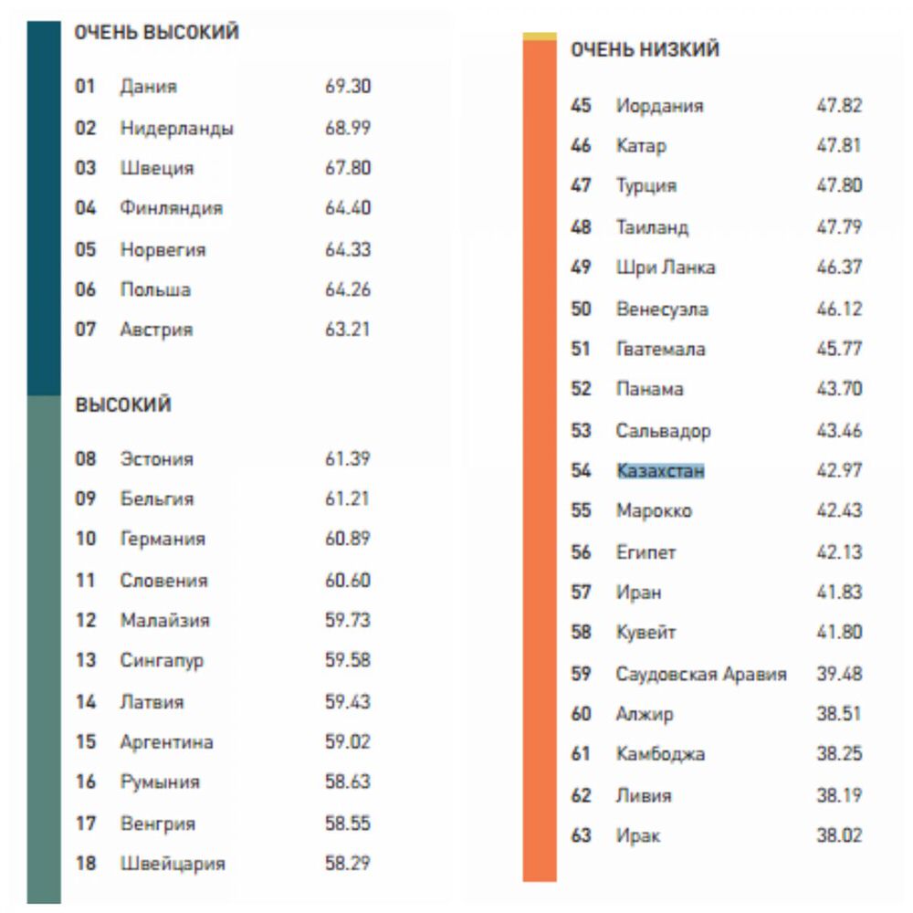 Так, согласно исследованию Казахстан расположился лишь на 54-й строчке из 70, оказавшись практически в конце рейтинга с отметкой «очень низкий показатель». При этом наша страна обогнала Ирак, Ливию, Алжир, Камбоджу, Иран, Саудовскую Аравию, Кувейт и Египет с Марокко.