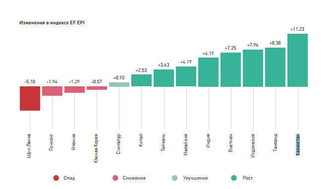 Аналитики отмечают, что с 2007 года средний уровень владения английским языком в Азии увеличился на 3,5 пункта и Казахстан лидирует в данной «номинации».