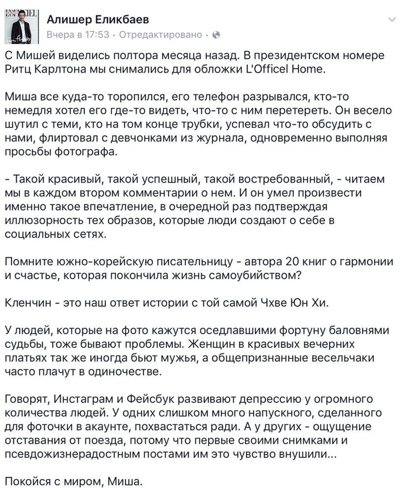 Десятки пользователей социальных сетей, не веря в произошедшее, писали посты со словами соболезнования и буквальным отрицанием официальной версии следствия. Никто не хотел верить, что молодой мужчина в самом расцвете сил и карьеры мог пойти на такой шаг.