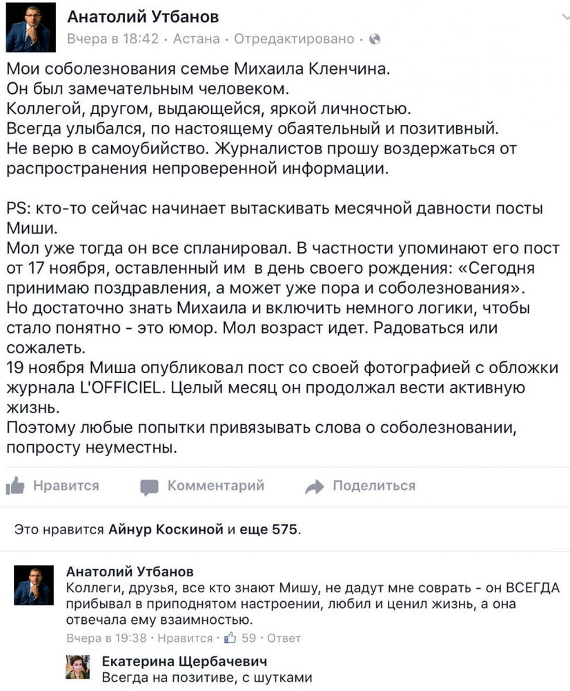 Вчера, 12 декабря, весь Казахстан шокировала страшная новость о смерти известного юриста Михаила Кленчина. С самого утра в социальных сетях то и дело появлялись разные версии, подтверждающие и опровергающие официальную на данный момент версию полиции о самоубийстве.