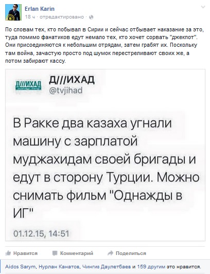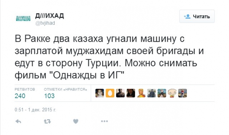 Ряд СМИ пишет, что «два боевика террористической группировки «Исламское государство» (ДАИШ) обокрали своих единомышленников. Так, джихадисты из Казахстана угнали автомобиль, на котором перевозилась зарплата других экстремистов ИГ. Инцидент, как сообщается, произошел в сирийском городе Ракка – столице радикалов.