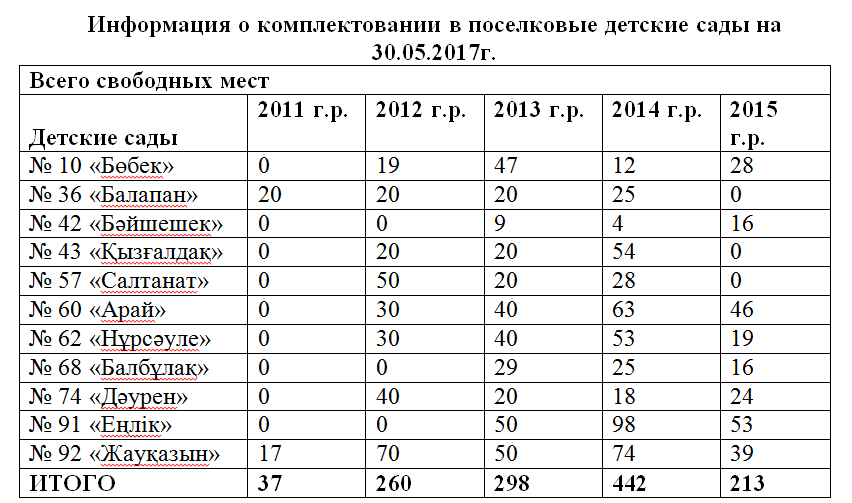Как сообщалось, в 2017 году в Астане выделено 6310 мест в столичные госдетсады. При этом свободные места в поселковых детских садах вошли в общее количество свободных мест по госдетсадам в столице.