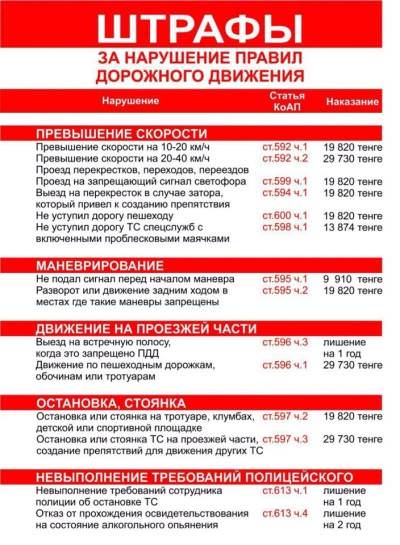 Так, размер месячного расчетного показателя увеличился на 139 тенге и составил 2121 тенге. Поэтому автолюбителям грозят новым ужесточением штрафов за нарушение ПДД после вступления поправок в закон «О дорожном движении» и сопутствующим нормативным актом.