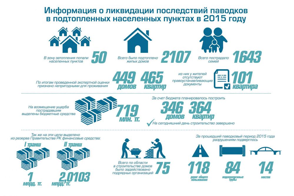Таким образом, по информации и.о. начальника ДЧС Мурата Катпанова, при активном развитии паводковой ситуации частично или полностью может быть подтоплен 161 населенный пункт с численностью населения до 38 135 человек. Также в зоне затопления может оказаться до 120 участков автодорог (118 – в 2015 г.), 11 железнодорожных и 22 автодорожных моста (14 – в 2015 г.), а также 16 участков железных дорог. Без электроснабжения может остаться 61 сельский населенный пункт».