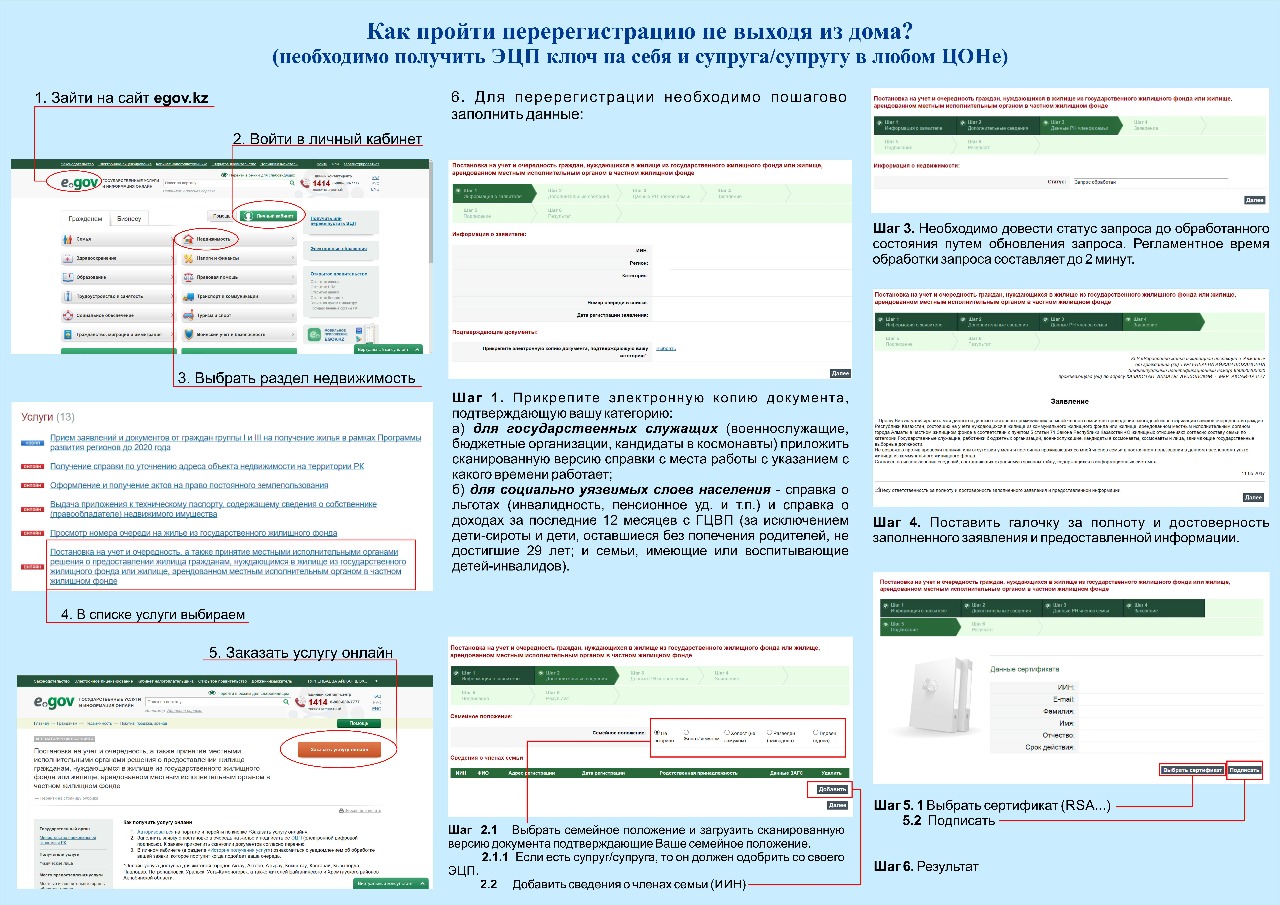 «У кого нет такой возможности, можно пройти перерегистрацию в ЦОНе, в секторе самообслуживания. Для этого надо иметь электронную цифровую подпись, которую можно получить там же в ЦОНе, и доступ в интернет. Пошаговый алгоритм размещен на сайте управления жилья http://uzh-almaty.kz/ru/page8278/page8298/. Теперь тратить много времени в очереди на перерегистрацию не нужно», – добавил Т. Абилов.