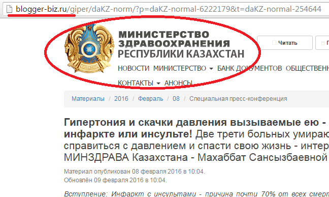 Агрессивный способ продвижения медицинского препарата выбрали производители средства «Нормалайф». Под видом сайта Министерства здравоохранения они опубликовали псевдонаучную статью, в которой «нагоняют жути» на читателя, намеренно выделяя жирным шрифтом любое упоминание о смерти от гипертонии. Ну а когда клиент «созрел», со страницы-подделки купить чудодейственный препарат рекомендует «глава института кардиологии Минздрава РК», за которого выдают Махаббат Бекбосынову, известного кардиолога, но к министерству отношения не имеющего.