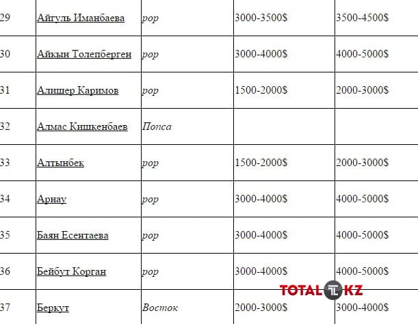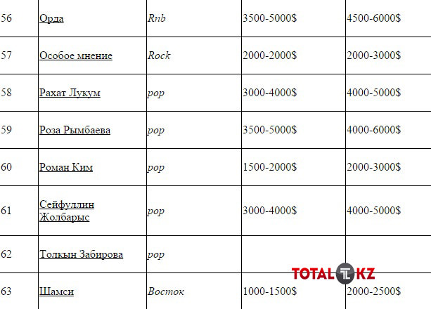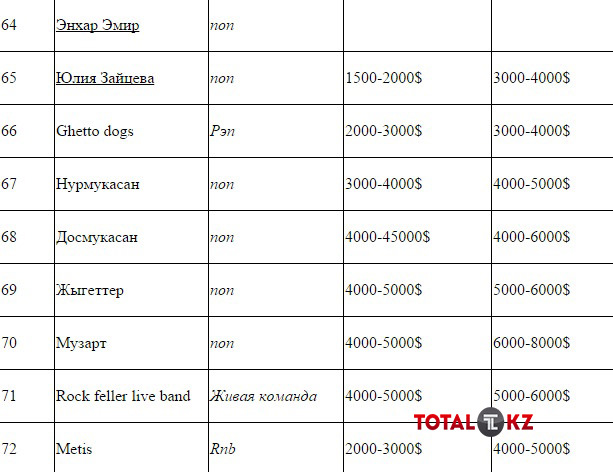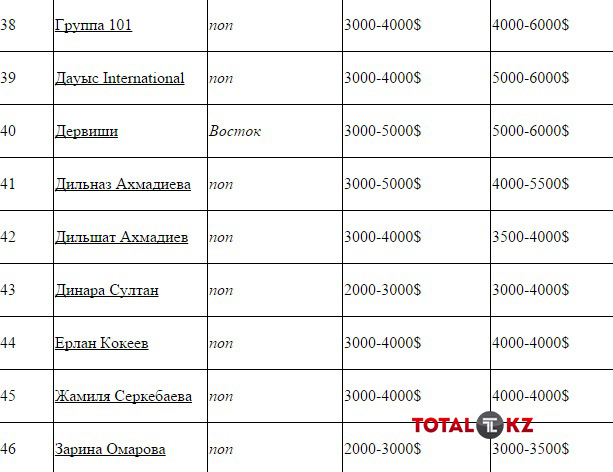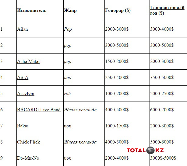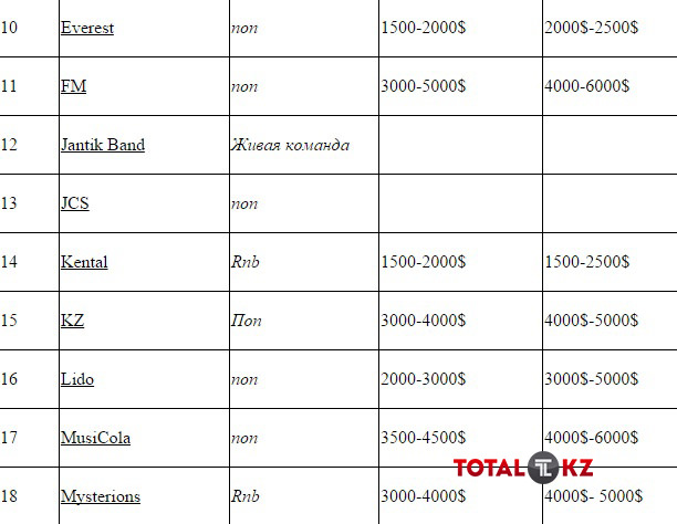 Так, самой дорогой группой в Казахстане, согласно прайс-листу, оказался коллектив Музарт. Исполнение восьми песен в новогоднюю ночь обойдется заказчику в 8 тысяч долларов. При этом стоит помнить и про райдер исполнителей, который несет дополнительные затраты. Так, если выступление запланировано за пределами Алматы, то расходы по перелету и проживанию берет на себя заказчик. Представители эстрады уточнили, что певцы готовы лететь даже эконом-классом, а если «точка выступления» расположена вблизи города, то подойдет и машина.