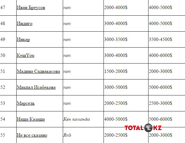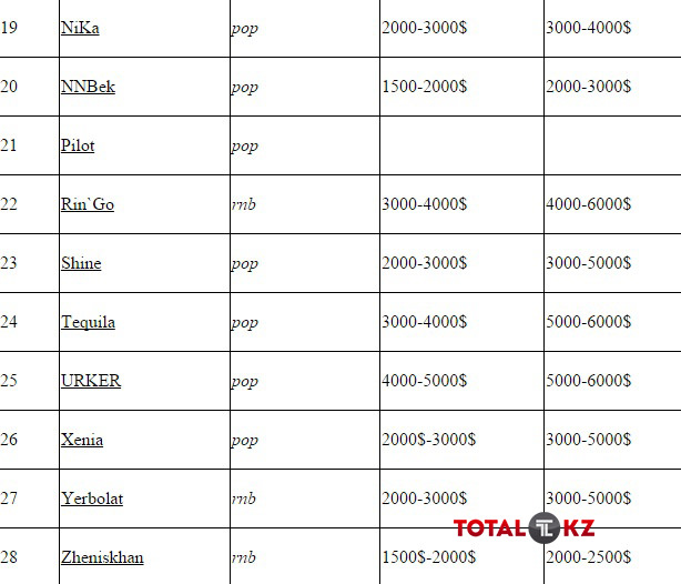 По прайсу певец Kental попал в топ самых «бюджетных» выступлений. В данный рейтинг также вошли: Asha Matai, Assylym, Bakai, Everest, Zheniskhan, песни которых обойдутся в среднем в 2 тысячи долларов.